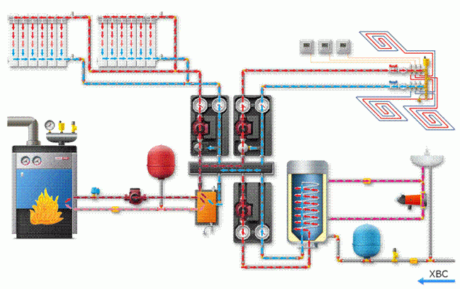 Насосные группы Meibes UK используются для подачи теплоносителя на контур из нагревательного оборудования. При этом смешивания с теплоносителем из обратной линии не происходит. Используются для радиаторного отопления, контура вентиляции и контура загрузки бойлера ГВС