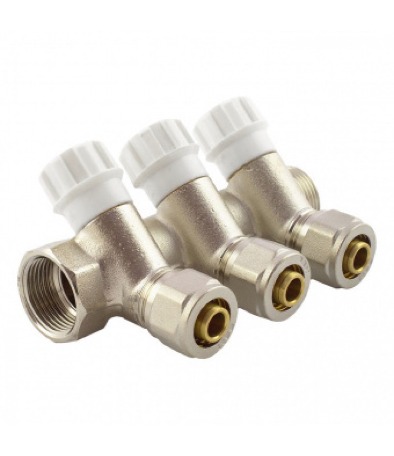 Коллектор соединительный 16х3/4"х3 выхода. В комплекте с цангами на металлопластик 16х2 мм. При снятии цанги - обычная трубная резьба 1/2". На барашках вентилей пластина имеет два цвета (холодная/горячая вода). Материал изготовления - никелированная латунь.