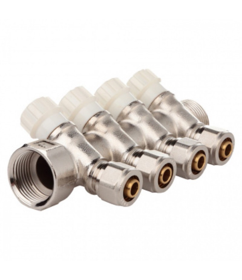 Коллектор соединительный 16х3/4"х4 выхода. В комплекте с цангами на металлопластик 16х2 мм. При снятии цанги - обычная трубная резьба 1/2". На барашках вентилей пластина имеет два цвета (холодная/горячая вода). Материал изготовления - никелированная латунь.