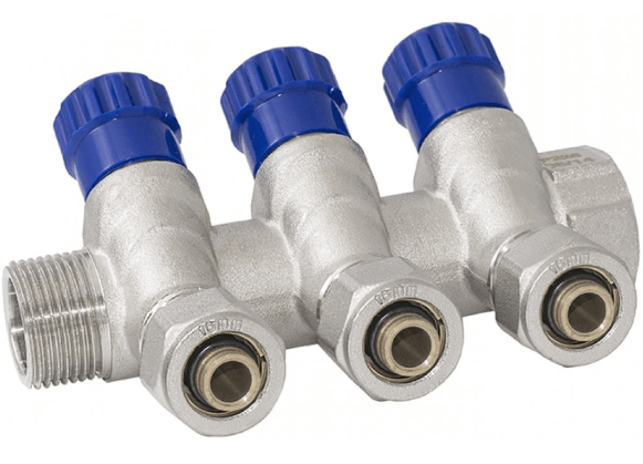 Коллектор со встроенными шаровыми кранами и цангами PF MV 268.C распределяет воду по потребителям и позволяет отключать каждого из них в отдельности, но не имеет возможности регулировать расход на каждом отводе, для каждого конкретного потребителя. Отключение конкретного потребителя происходит путём перекрытия потока через соответствующий отвод с помощью шарового крана.