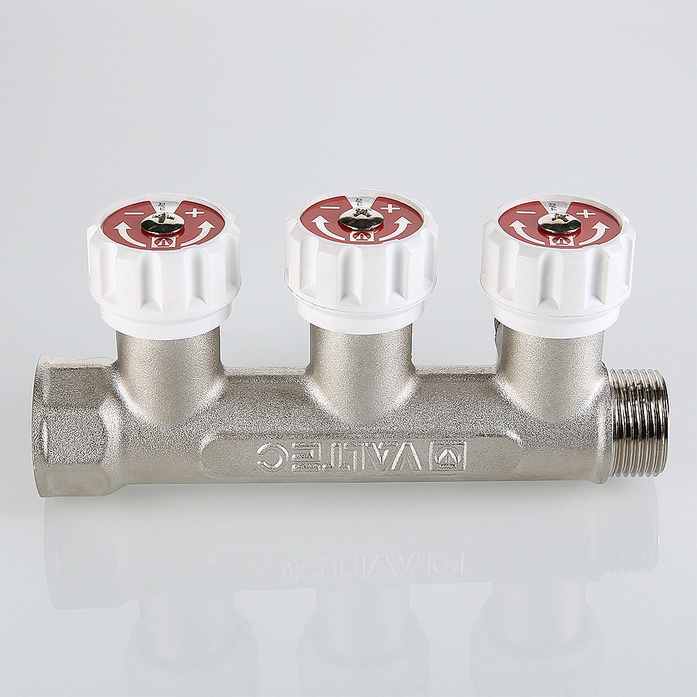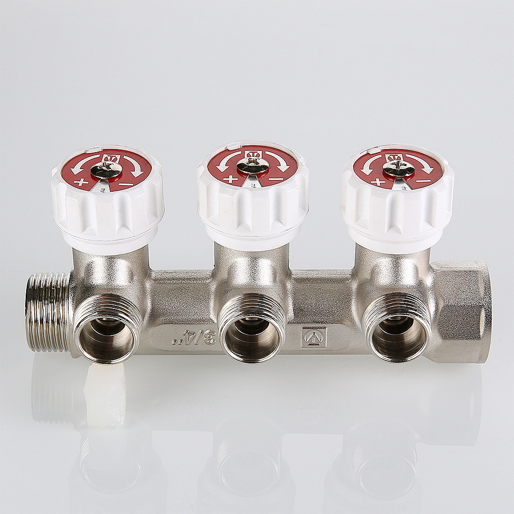 Латунный никелированный коллектор c выходами 1/2" (резьба – наружная). На каждом выходе предусмотрен вентиль для регулирования расхода рабочей среды. Диаметр коллектора – 3/4", резьба – внутренняя/наружная