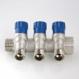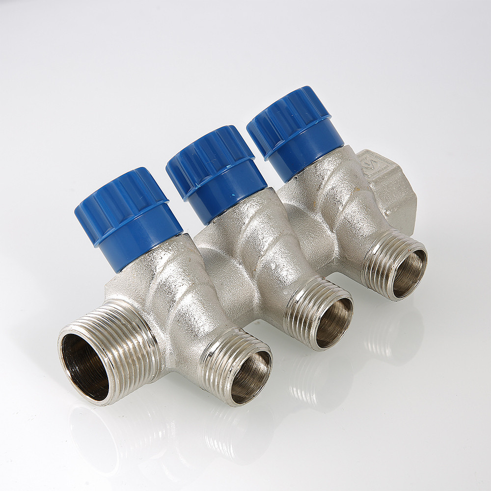 Латунный никелированный коллектор на 2, 3 и 4 выхода диаметром 1/2" с наружной резьбой. На каждом выходе предусмотрен вентиль для регулирования расхода рабочей среды со средним полным ресурсом 8 тыс. циклов