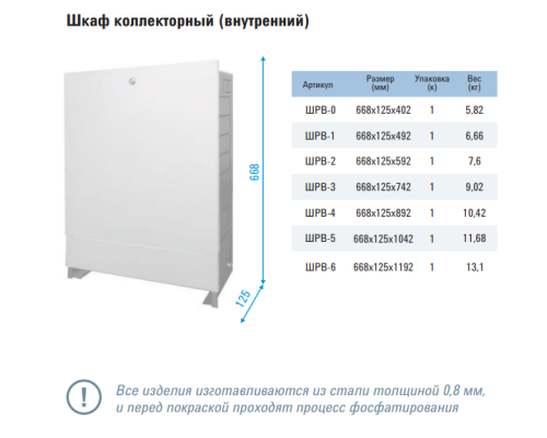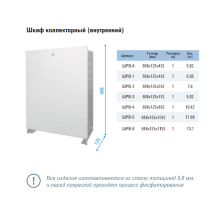 Встраиваемый коллекторный шкаф ШРВ номер 5 (668х125х1042) применяется для монтажа и скрытия с глаз такого оборудования, как коллекторные группы, коллектора, смесительные узлы, запорная арматура, а также других компонентов по мере необходимости.