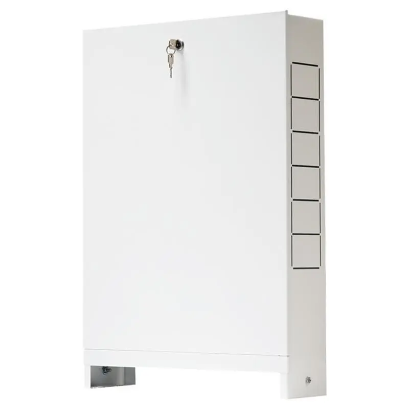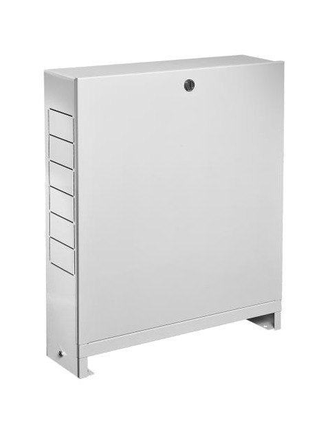Такой шкаф изготовлен из стали, покрытой белой эмалью и в случае необходимости может быть перекрашен в любой цвет или оклеен обоями в цвет комнаты. Тип ШРН-03 — относится к шкафам наружного монтажа т.е. к стене. После того, как монтажник установит в коллекторный шкаф распределительную гребенку и подключает к ней трубы теплого пола или лучевой системы радиаторного отопления — шкаф закрывается крышкой, что позволяет скрыть монтажные элементы. Такие шкафы для гребенок носят исключительно декоративную функцию и не влияют на работу систем отопления.