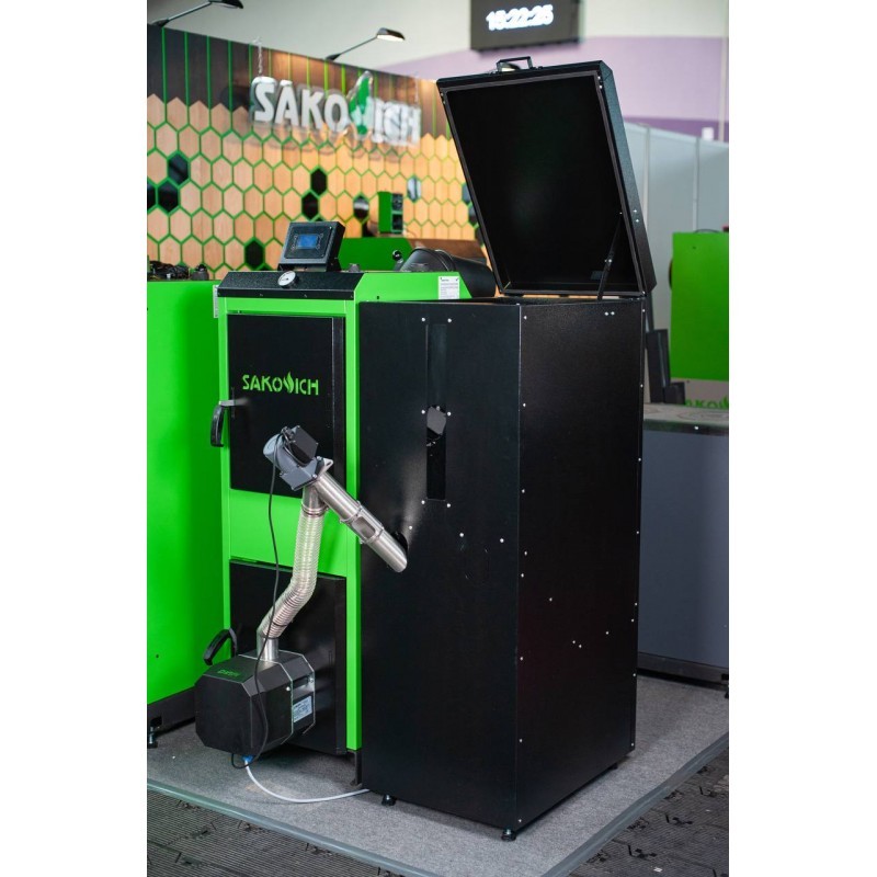 Бункер для топлива устойчив к термической нагрузке, что позволяет разместить его у котла. Конструкция бункера надёжна и испытана на давление и вес. Ёмкости спроектированы таким образом, что подача гранул происходит без зависания. Наши ёмкости приспособлены к подключению подающего устройства ø60мм справа или слева от котла. Объём бункера 550 литров.