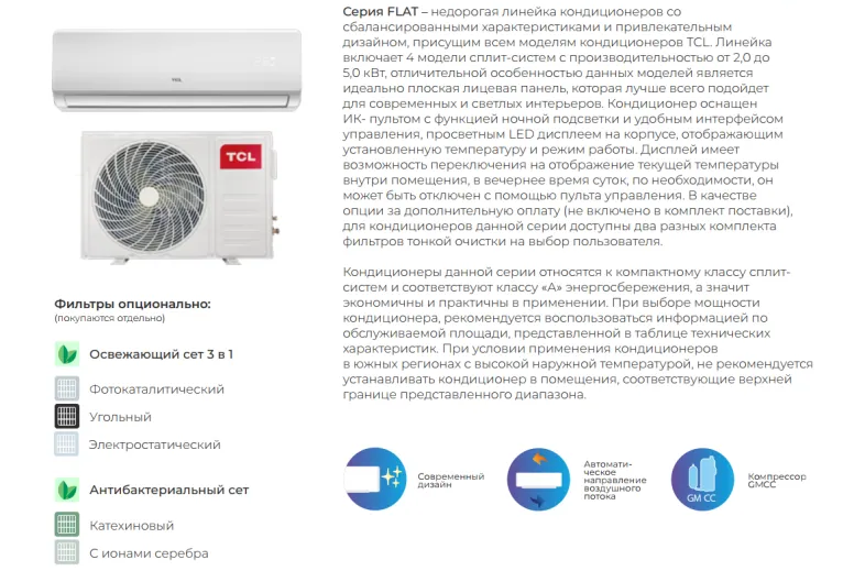 Серия FLAT – недорогая линейка кондиционеров со сбалансированными характеристиками и привлекательным дизайном, присущим всем моделям кондиционеров TCL. Линейка включает 3 модели сплит-систем с производительностью от 2,0 до 3,5 кВт, отличительной особенностью данных моделей является идеально плоская лицевая панель, которая лучше всего подойдет для современных и светлых интерьеров. Кондиционер оснащен ИК-пультом с функцией ночной подсветки и удобным интерфейсом управления, просветным LED дисплеем на корпусе, отображающим установленную температуру и режим работы. Дисплей имеет возможность переключения на отображение текущей температуры внутри помещения, в вечернее время суток, по необходимости, он может быть отключен с помощью пульта управления. В качестве опции за дополнительную оплату (не включено в комплект поставки), для кондиционеров данной серии доступны два комплекта фильтров тонкой очистки на выбор пользователя. Кондиционеры данной серии относятся к компактному классу сплит-систем и соответствуют классу «А» энергосбережения, а значит экономичны и практичны в применении. При выборе мощности кондиционера, рекомендуется воспользоваться информацией по обслуживаемой площади, представленной в таблице технических характеристик. При условии применения кондиционеров в южных регионах с высокой наружной температурой, не рекомендуется устанавливать кондиционер в помещения, соответствующие верхней границе представленного диапазона.