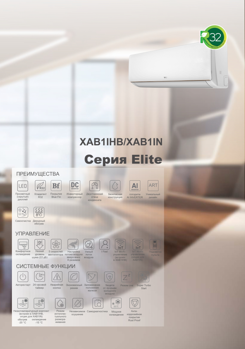 Cистемные функции: авторестарт, аварийная кнопка, защита от прорыва холодного воздуха, независимое осушение, таймер, режим сна, турбо режим, запоминание положения жалюзи, функция самодиагностики, антикоррозийная обработка внутреннего и наружного блоков Blue fin, панель с просветным дисплеем, функция I-feel