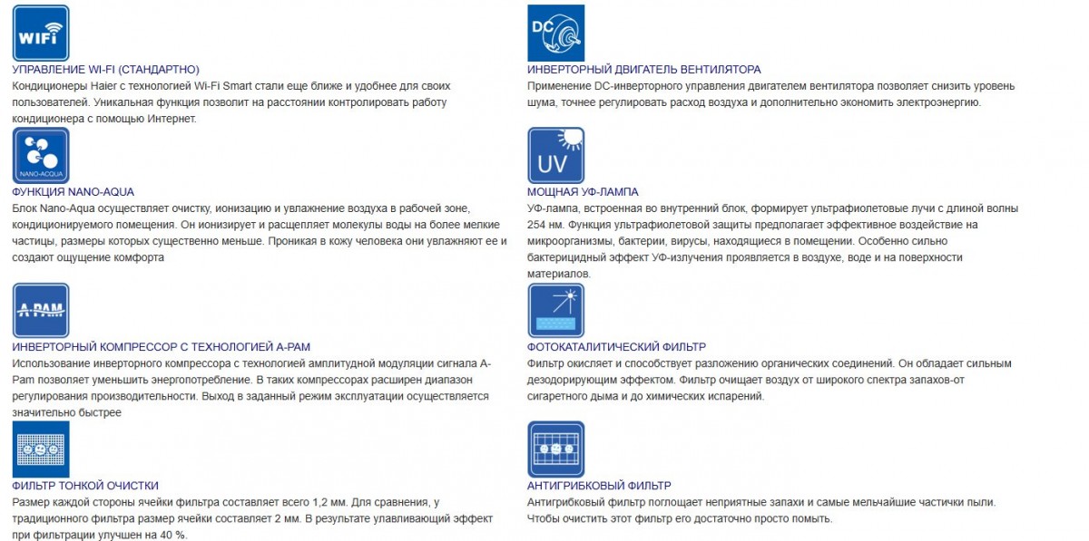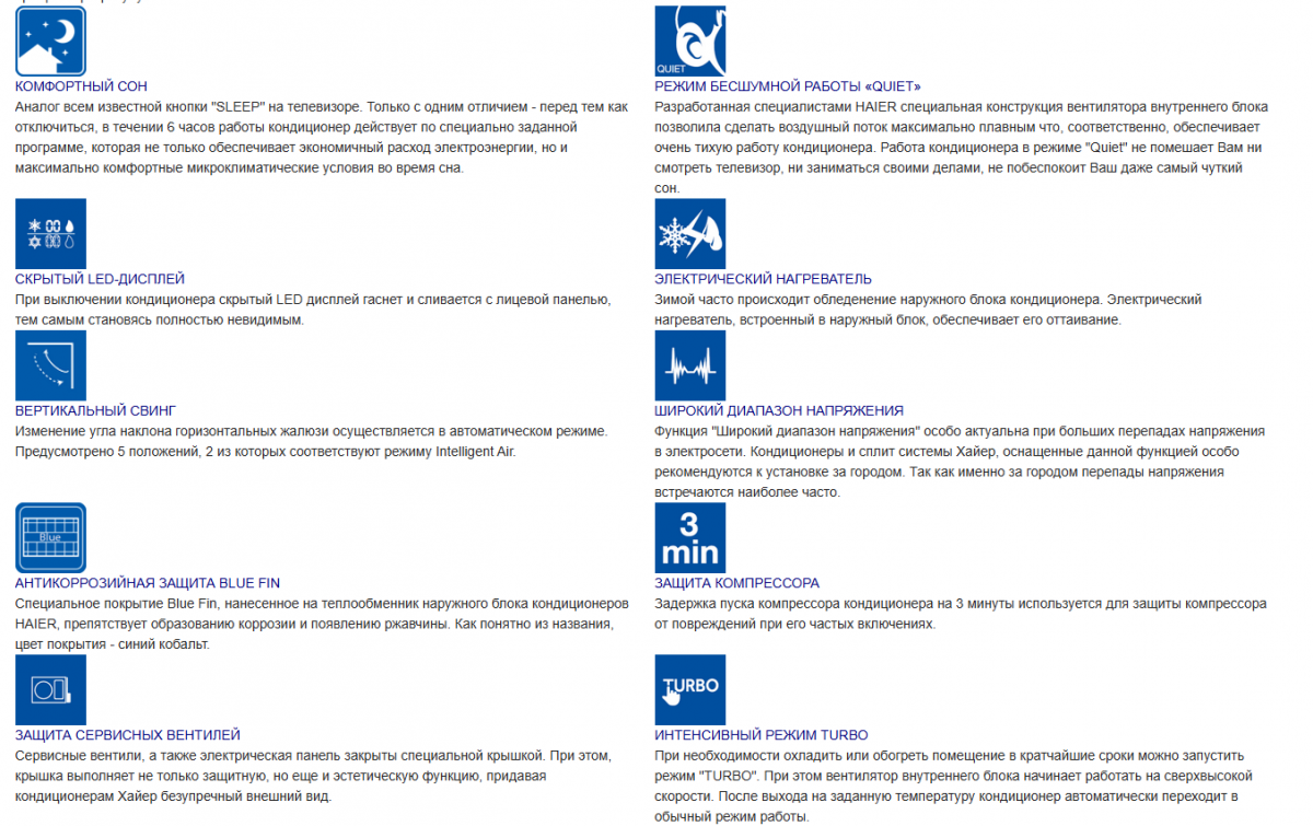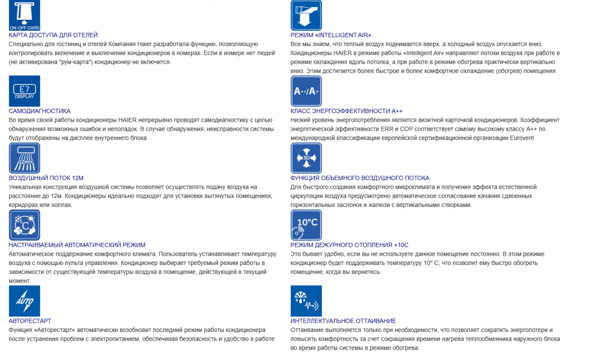 Основным преимуществом данного кондиционера является широкий набор встроенных пользовательских функций, а также элегантный дизайн внутреннего блока, который несомненно станет украшением любого интерьера. Основные функции кондиционера: