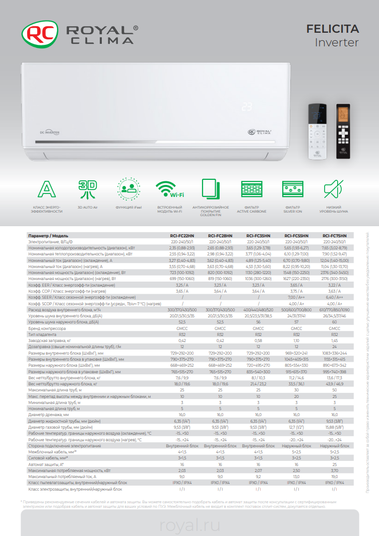 Сплит-система Royal Clima Felicita Inverter RCI-FCE30HN, настенный внутренний блок, мощность охлаждения 3 кВт, мощность обогрева 3.45 кВт, площадь обогрева до 30 м2, хладагент R 32, инвертор