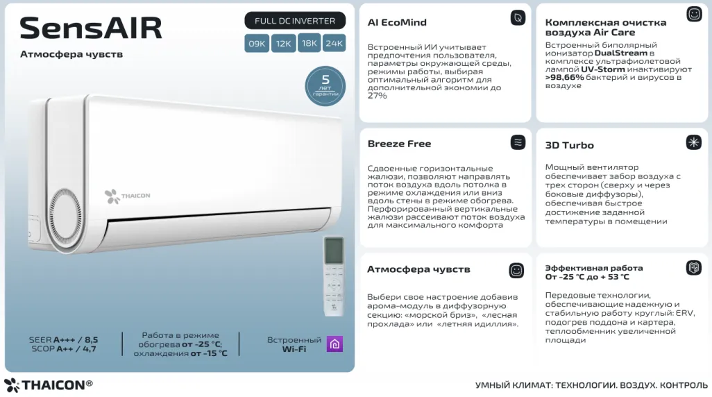Кондиционеры THAICON — это прорыв в создании комфортного микроклимата: сочетание передовых технологий, энергоэффективности и заботы о здоровье. Модель объединяет инженерное совершенство и интуитивное управление, чтобы подарить вам пространство с идеальным воздухом в любое время года.