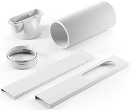 Для удобства установки и подключения шланга вместе с устройством поставляется оконная заглушка. Для сбора конденсата во время эксплуатации мобильного кондиционера используется встроенный лоток. Когда уровень воды в лотке достигает максимальной отметки, кондиционер прекращает свою работу и на панели управления загорается соответствующий код ошибки. После слива конденсата из лотка (данная операция выполняется пользователем самостоятельно) устройство снова продолжает работать. Для отвода конденсата при эксплуатации мобильного кондиционера в режиме осушения используется дренажный шланг (входит в комплект поставки). При низкой влажности в помещении в случае эксплуатации мобильного кондиционера в режиме охлаждения или вентиляции подключение дренажного шланга, как правило, не требуется. Устройство сконструировано так, что во время его работы большая часть конденсата испаряется и выводится наружу вместе с горячим воздухом.