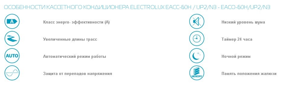 Кассетные кондиционеры Electrolux EACC-48H/UP3/N3 серии Unitary Pro 3 идеально подойдут для создания комфортного климата в больших и просторных помещениях: офисах, учебных заведениях, фитнес-клубах. Они легко встраиваются в подвесной потолок и отлично вписываются в любой интерьер благодаря декоративной панели белого цвета. Толщина внутреннего блока составляет от 27 до 30 сантиметров в зависимости от модели. Кассетные сплит-системы Electrolux EACC-48H/UP3/N3 способны не только эффективно охладить или прогреть помещение, но и осушить воздух при его избыточной влажности или работать в режиме простой вентиляции без изменения температуры. Система самодиагностики вовремя сообщит вам обо всех неполадках и не даст упустить момент обращения в техническую службу.