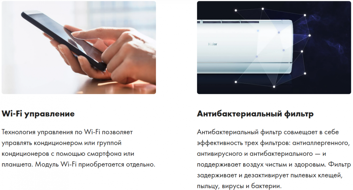 КОНДИЦИОНЕР HAIER LIGHTERA HSU-12HNF303/R2-G с функцией Wi-Fi (опция) - есть разъем для модуля, приобретаемого отдельно. Благодаря этой функции Вы сможете управлять кондиционером с помощью смартфона, планшета или ноутбука. У кондиционера есть ультрафиолетовая UV лампа, а также NANO-AQUA - генератор создающий отрицательно заряженные микрорадикалы воды, эффективно уничтожающие бактерии путем соединения с белком на поверхности и изменением его структуры. Сплит-система также обладает автоматическим выбором режима - в зависимости от значений заданной и фактической температуры в помещении микропроцессор автоматически переключит сплит-систему в режим обогрева, осушения или охлаждения.