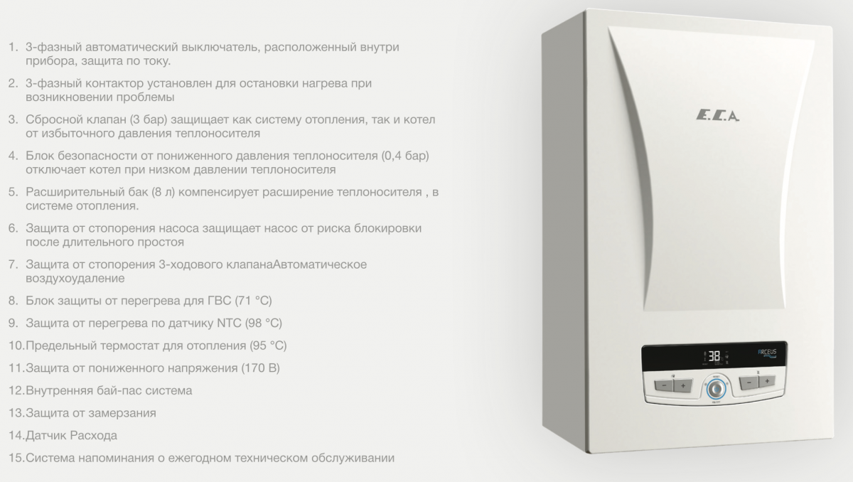 Одноконтурный электрический котел E.C.A Arceus ST отличается компактными габаритами и простой установкой. Оснащён нагревательным элементом с трехступенчатым регулированием мощности и рассчитан на создание отопительного контура. К оборудованию можно подсоединить накопительный бойлер. Котлы E.C.A Arceus серии ST укомплектованы трехходовым клапаном и датчиком температуры бойлера.