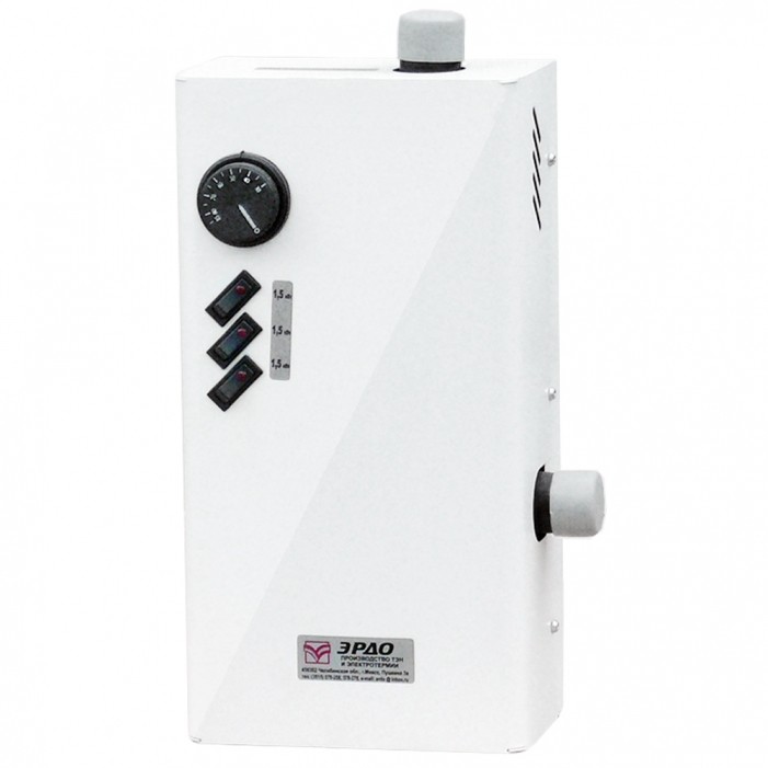 Электроводонагреватель состоит из корпуса, стальной ёмкости, пульта управления, закрепленного внутри корпуса. В нижней части ёмкости, во фланце, смонтированы трубчатые электронагреватели. Элeктрoкoтёл имеет встроенный пульт управления, предназначенный для переключения мощности и регулирования температуры нагрева теплоносителя. Регулятором температуры элeктрoкoтла служит капиллярный термостат, термочувствительный элемент которого закреплен в средней части стальной ёмкости (резервуара). Для защиты от перегрева электроводонагреватель оборудован аварийным термостатом с механическим возвратом, расположенным в верхней части колбы котла. Верхний напорный и нижний обратный патрубки предназначены для присоединения водонагревателя к системе отопления. На лицевой стороне водонагревателя расположена ручка регулятора температуры нагрева воды и клавиши вкключения мощности. На нижней части корпуса имеется сальник для ввода в водонагреватель питающего кабеля. Болт для крепления заземляющего провода расположен внутри корпуса на кронштейне крепления колбы котла.