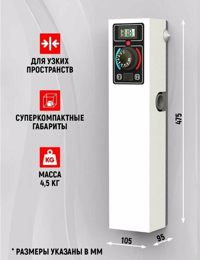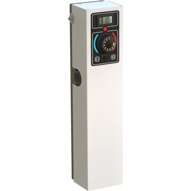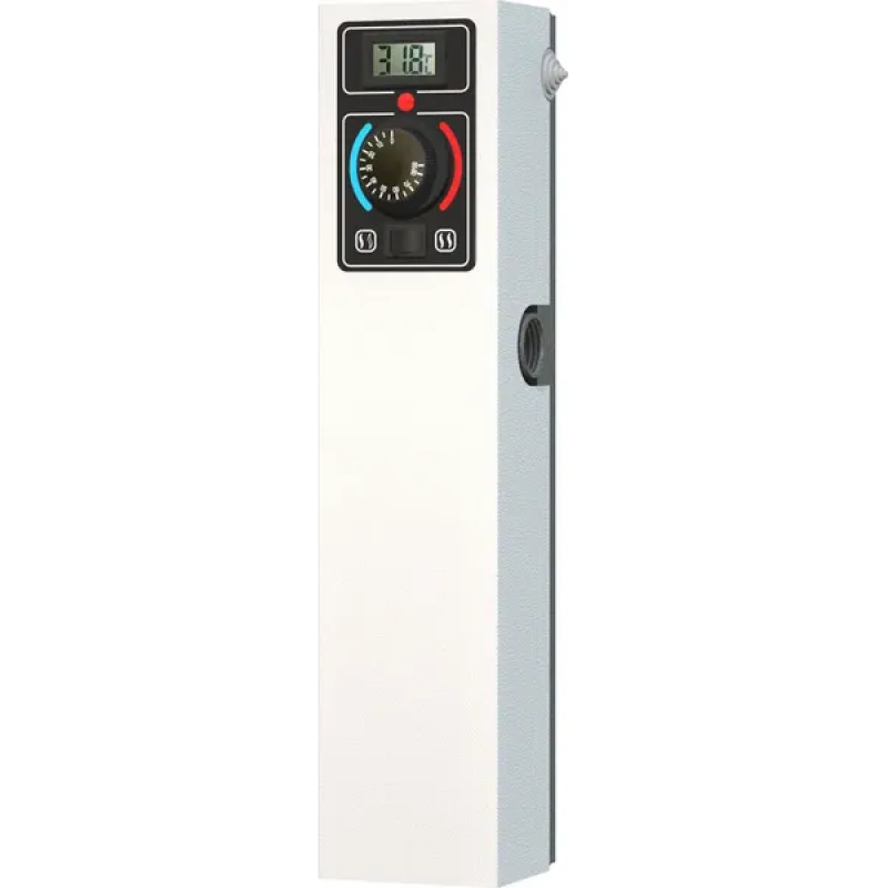Регулировка температуры осуществляется поворотным терморегулятором, без электроники и сложных настроек. Две ступени мощности позволяют выбрать оптимальный режим работы в зависимости от площади помещения и текущих теплопотерь. Котёл отличается компактными габаритами, малым весом и подходит для установки в нишах, кладовых и технических помещениях.