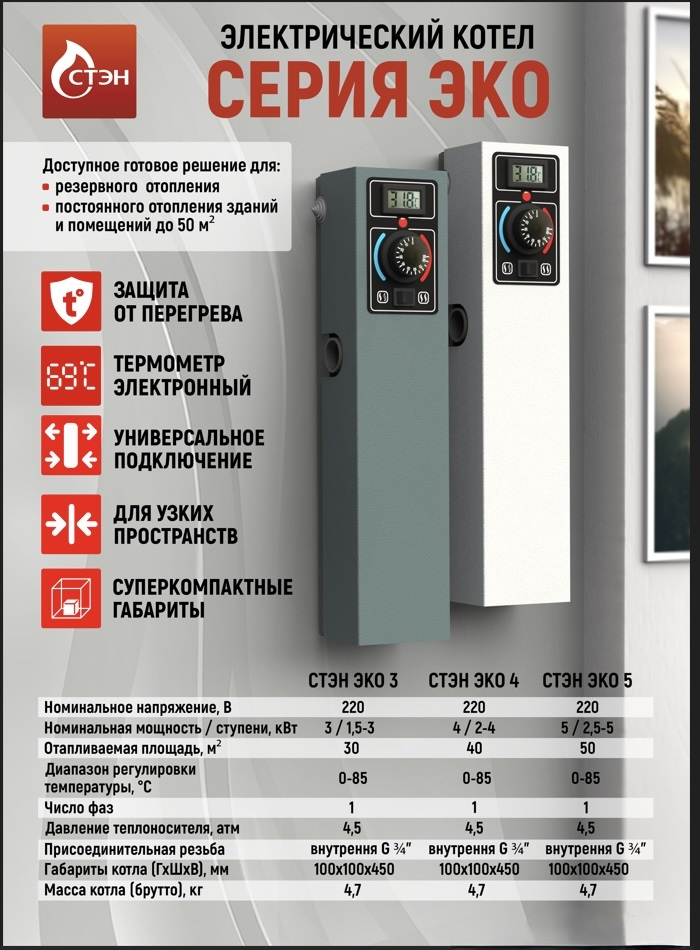 Электрический котёл СТЭН ЭКО 4 в белом корпусе предназначен для автономного отопления небольших помещений и резервных систем. Модель работает от однофазной сети 220 В и оснащена механической системой управления, что делает её простой, надёжной и неприхотливой в эксплуатации.