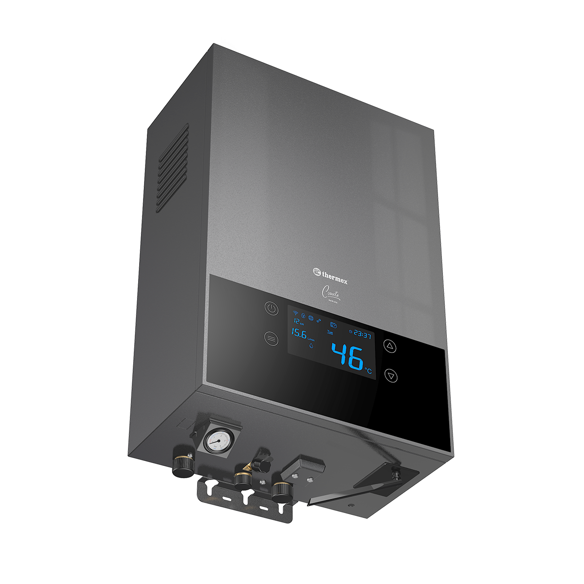 Комфортное управление. В котле реализовано электронное управление, которое производится через панель на фронтальной стороне. Панель оснащена необходимыми индикациями, с помощью которых пользователь получает все данные по работе оборудования: индикатор выбранной мощности, скорость потока, температура теплоносителя, режимы контура обогрева – радиатор или теплый пол, контур ГВС, таймер, системы защиты и т.д. Благодаря встроенной технологии Wi-Fi Motion электрическим котлом можно управлять также дистанционно с помощью приложения Thermex Home. Не только контролировать корректность работы котла, но и настраивать алгоритмы нагрева, температуру и многое другое.