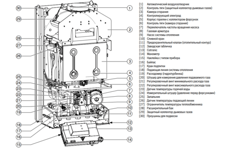 Для работы котла можно использовать как природный, так и сжиженный газ (при соответствующей перенастройке). Оснащение котла: встроенный трехступенчатый циркуляционный насос, кран подпитки системы отопления, расширительный бак с воздухоотводом, манометр давления в отопительном контуре.