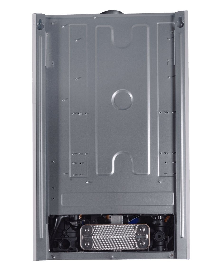 Конструкция котла включает в себя первичный теплообменник изготовлен из меди, а вторичный — из нержавеющей стали, что гарантирует длительный срок службы и устойчивость к коррозии. Безопасность эксплуатации обеспечивается закрытой камерой сгорания с принудительным отводом продуктов сгорания через коаксиальный дымоход диаметром 60/100 мм. Стандартные подключения предусматривают диаметр ¾ дюйма для отопления и холодного водоснабжения, а для горячего водоснабжения используется подключение ½ дюйма.