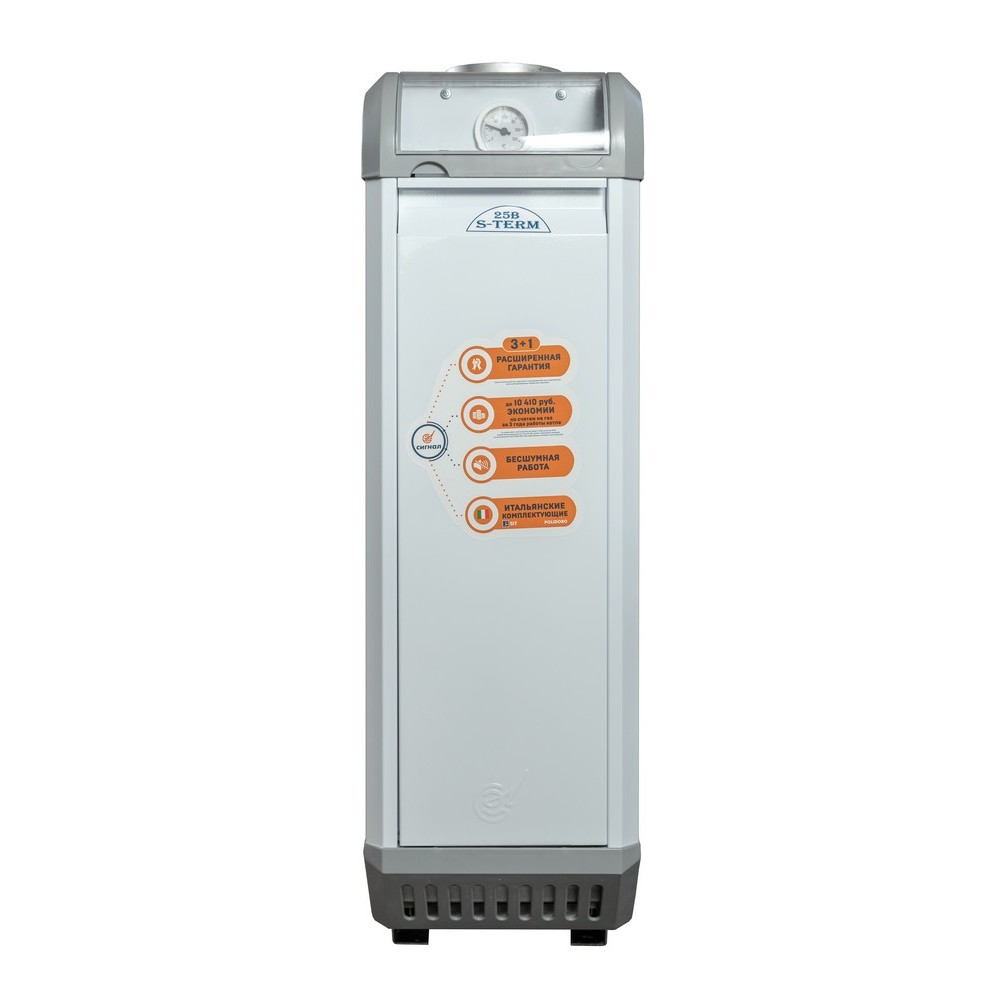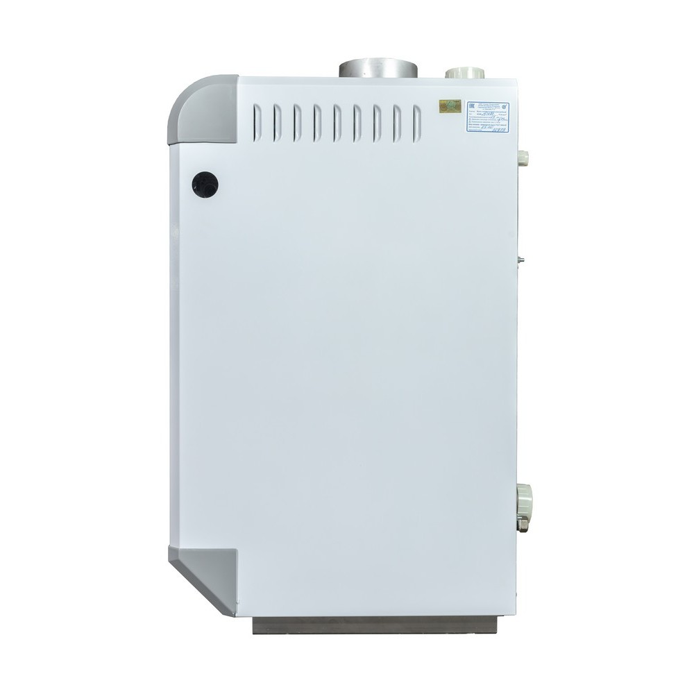 Отличительная особенность котла – это вынесенный на переднюю панель регулятор и пьезорозжиг. Теперь если вы хотите отрегулировать степень мощности или осуществить запуск оборудования, не нужно открывать крышку. Для этого есть небольшое окошко, которое поднимается, и затем осуществляются необходимые манипуляции. Там же рядом расположен круглый аналоговый термометр, по которому можно узнать температуру. Выход дымовой трубы вертикальный, как и у собратьев по классу. Сразу за патрубком дымохода расположен водяной выход, что не характерно для других подобных изделий. Сзади внизу есть отверстие для подачи теплоносителя и для слива.