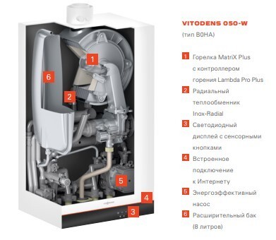 Конденсационный котел Viessmann Vitodens 50-W оснащен теплообменником Inox-Radial, изготовленным из нержавеющей стали. Высочайшие качества надежности компания Viessmann подтверждает предоставлением расширенной гарантии на теплообменник 10 лет. В конструкции котла используется инфракрасная горелка Matrix, также применяемая на котлах Vitodens 100-W, позволяющая значительно снизить выбросы вредных веществ в атмосферу при работе котла, обладает широким диапазоном модуляции и обеспечит полноценную работу котла в широком диапазоне давления магистрального газа.