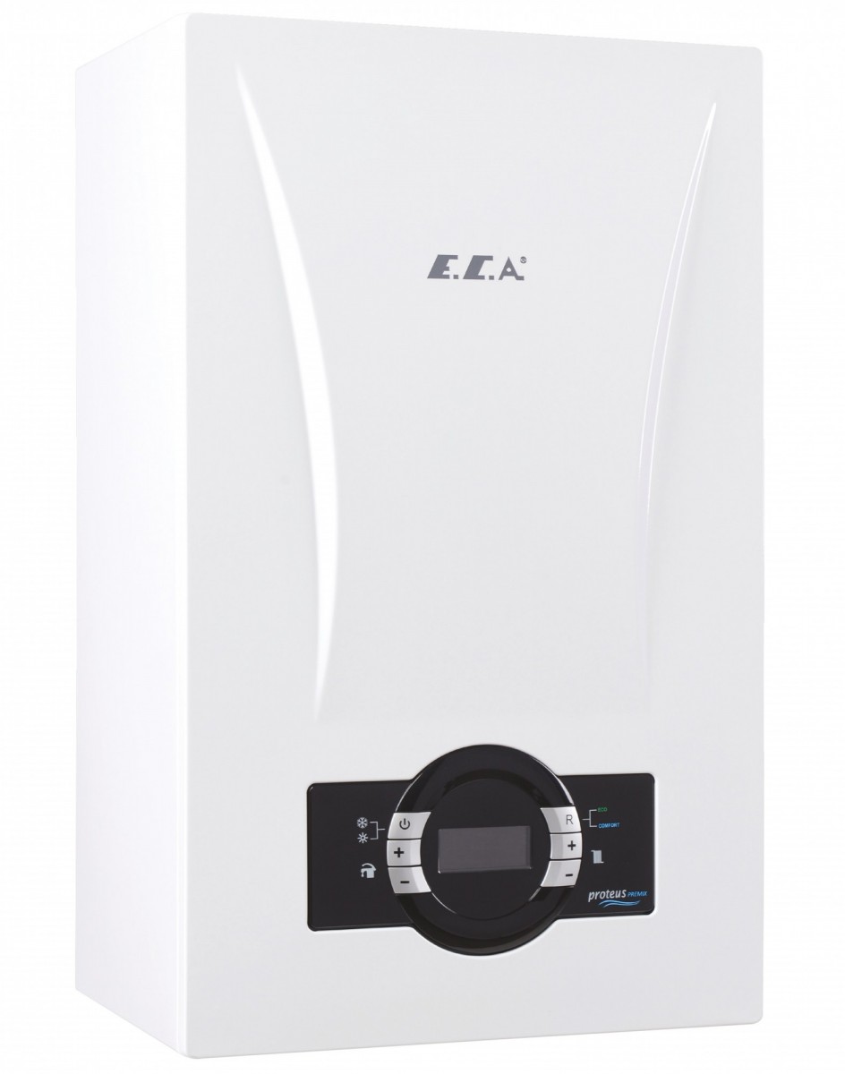 Газовый котел ECA Proteus Premix 35 HCH NG предназначен для отопления частных домов, коттеджей, загородных домов, дач площадью до 350 кв. м. Этот котел имеет раздельные теплообменники, что является большим преимуществом там, где вода богата солями кальция и магния, другими словами, вода жесткая. По умолчанию котел работает на природном магистральном газе, но при необходимости котел можно переоборудовать для работы на сжиженном газе, для этого необходимо приобрести комплект жиклеров. В своей конструкции котел отопления уже имеет циркуляционный насос Grundfos, поэтому необходимость в его приобретении отпадает Для работы платы управления конденсационного котла требуется его подключение к электрической сети 220 В. Для сохранения гарантии производители рекомендуют установку стабилизатора напряжения. Как выбрать стабилизатор, вы можете проконсультироваться у нашего специалиста. Закрытая камера сгорания (по-другому такие котлы называют турбированными) подразумевает наличие в данном котле вентилятора, который принудительно осуществляет забор воздуха и удаление продуктов сгорания на улицу или коллективный дымоход. Для таких котлов обычно используют коаксиальные дымоходы — "труба в трубе".