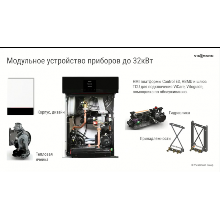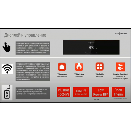 В конденсационные котлы Vitodens 100-W встроен интерфейс Wi-Fi, при помощи которого система отопления может быть подключена к Интернету. При использовании приложения ViCare (доступно на базе iOS и Android) легко управлять системой отполения, оно предоставляет информацию о текущем состоянии энергосистемы. Подключив ViCare-термостат, разработанный для использования с отопительными системами Viessmann, вы получаете возможность регулировать комнатную температуру через приложение.