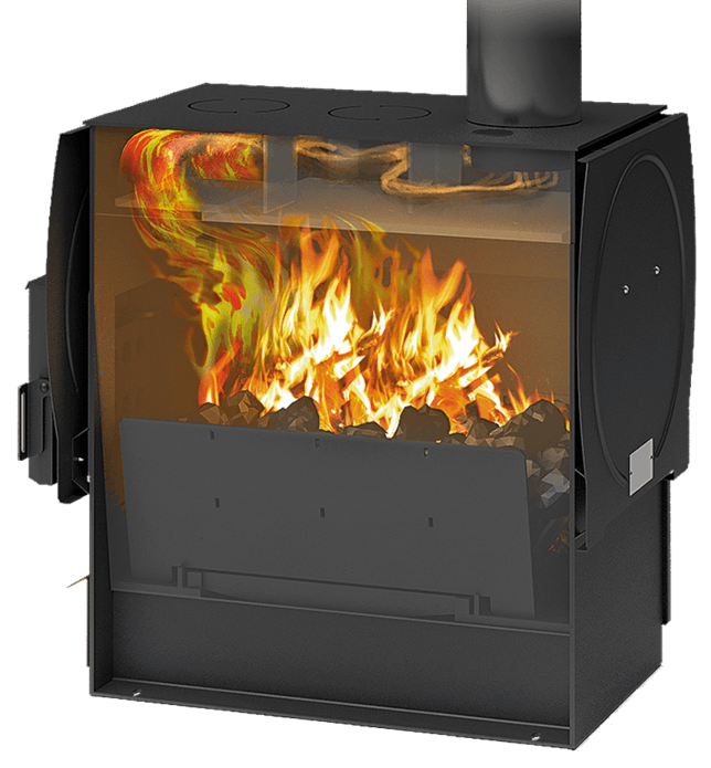 Топка печи изготовлена из 5 мм конструкционной стали, а наиболее термически нагруженные участки из стали толщиной 8 мм. Колосник у печи чугунный увеличенный в размере. по сравнению с другими печами Теплодар. За динамичный нагрев воздуха отвечает кожух-конвектор охватывающий топку печи по всему периметру. Дверца печи самоохлаждаемая с дополнительными отверстиями для подачи вторичного воздуха (для режима дожига газов). Сверху печи имеется варочная поверхность для приготовления или разогрева пищи.