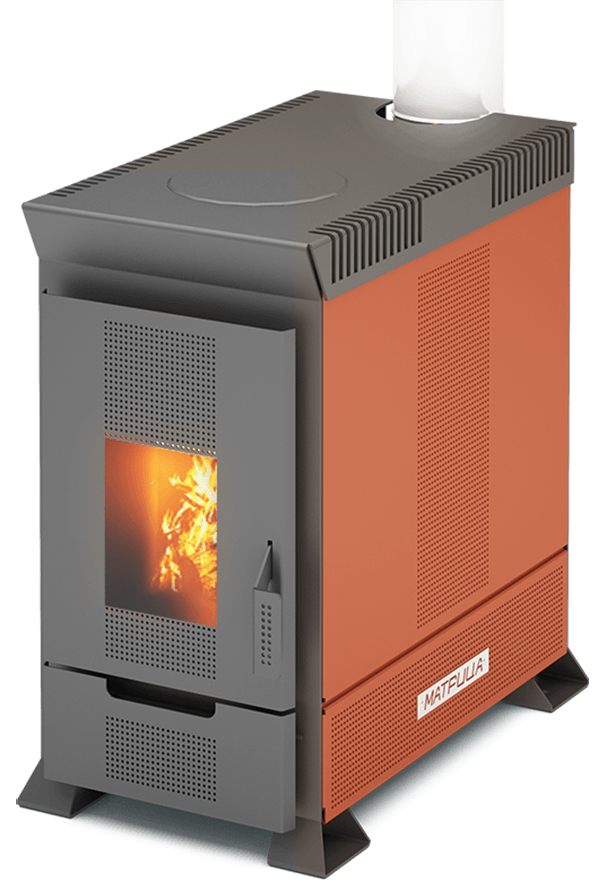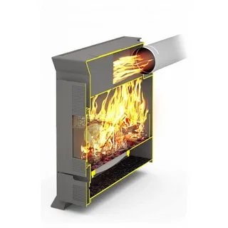Поворот дымовых газов обеспечивает увеличенный КПД и низких расход топлива при большой теплоотдаче. добавлена возможность подключения дымохода сзади без увеличения габаритов печи. Кожух-конвектор создает мощные потоки воздуха и быстро нагревает отапливаемое помещение. За эффективный оборот тепла в помещении отвечают боковые кожух-конвекторы, контроль горения осуществляется не открывая дверцы топки через стекло в ней. Подключение дымохода заднее горизонтальное, к комплекте с печью поставляется поворотный шибер для регулирования тяги в дымоходе. Контролируя порцию подачи воздуха в топку печи достигается режим тления на одной закладке топлива до 8 часов. На верхней поверхности печи Матрица можно приготовить (при интенсивном режиме работы печи) или разогреть (при работе печи в режиме тления) пищу.
