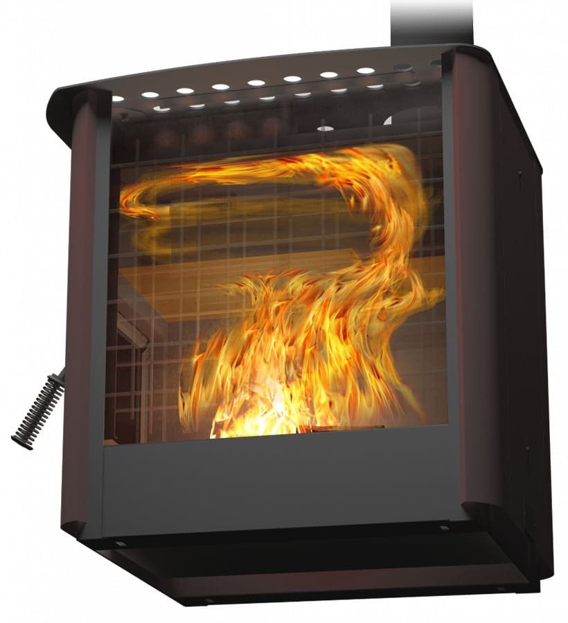 Оборотная топка с отбойниками пламени обеспечивает высокий КПД печи и низкую температуру на выходном патрубке дымохода (топливо максимально сгорает в топке печи).