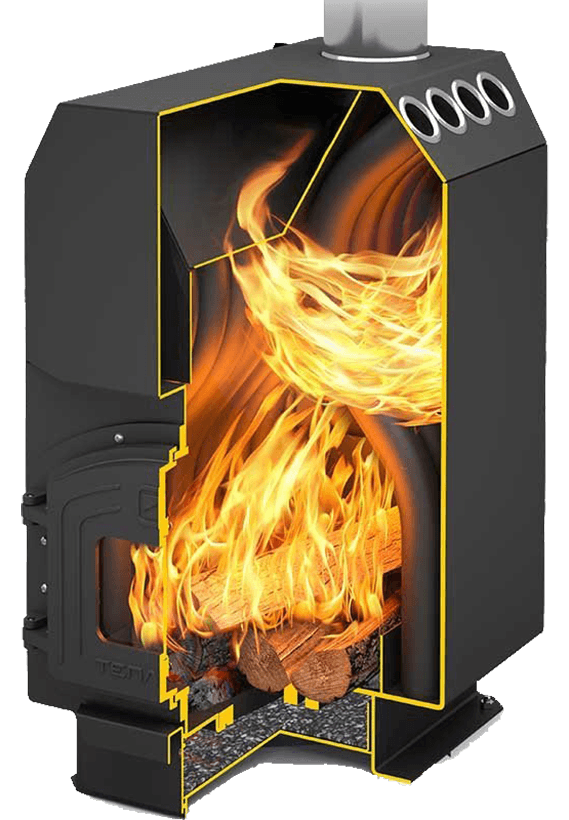 Потоки нагретого воздуха в трубах создают мощную циркуляцию воздуха, что позволяет быстро распределить его по помещению. В экономичном режиме печь способна работать до 8 часов на одной закладке дров. Вторичный дожиг газов возможен благодаря двум каналам подачи воздуха и значительно увеличивает КПД отопительной печи. Подключение дымохода сверху или сзади. Печь ТОП 200 укомплектована заслонкой для регулирования тяги и чугунной дверцей с термостойким стеклом. Дверца со стеклом позволяет контролировать процесс горения не открывая дверцы топки печи.
