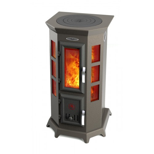 «Сексту» отличает более сложная архитектура фасада и большая площадь остекления топливника. Дополнительно к остеклению дверцы у этой печи имеется большой остекленный эркер, набранный из отдельных стекол, позволяющих наблюдать за огнем с разных углов зрения. Вертикальное расположение дров позволяет сократить габаритные размеры печи в плане и обеспечивает красивое горение дров по всей высоте топливника. Растапливать печь можно как классическим нижним розжигом, так и верхним розжигом, благодаря подаче горячего вторичного воздуха в верхний ярус топливника печи. Печь имеет две отдельные чугунные герметичные дверцы. Верхняя дверца топливника оснащена жаропрочным стеклом, а система «чистое стекло», оставляет его чистым с момента растопки до окончания горения. Нижняя дверца зольного ящика позволяет регулировать приток воздуха при помощи заслонки и выбрать любой режим работы печи - от интенсивного до экономичного.