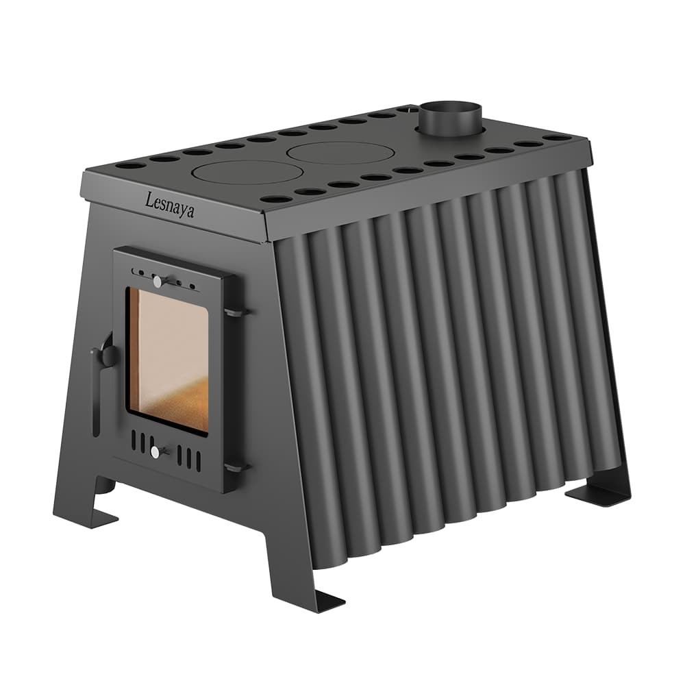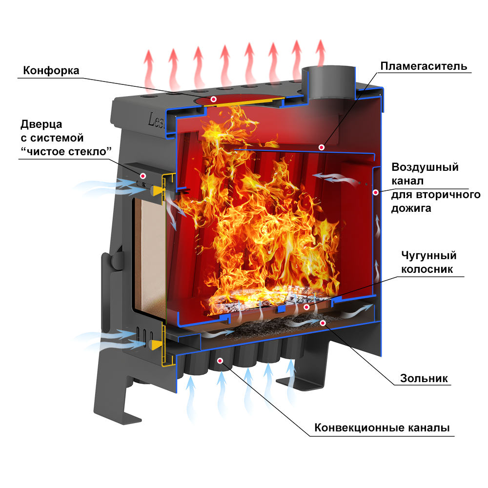 Конструкция печи включает в себя топку с пламегасителем и каналом вторичного дожига. Стенки топки выполнены из металлических труб, являющихся эффективными конвекторами. За счёт такой конструкции значительно ускоряется прогрев помещения, повышается эффективность сгорания топлива. Верхняя панель сделана с конвекционными отверстиями. В центре панели размещены 2 конфорки для приготовления и подогрева еды. Дверь изготовлена из стали толщиной 2-3 мм. Она оснащена нижней системой подачи воздуха в поддувальное пространство. С помощью заслонки двери можно регулировать интенсивность горения дров в топке.