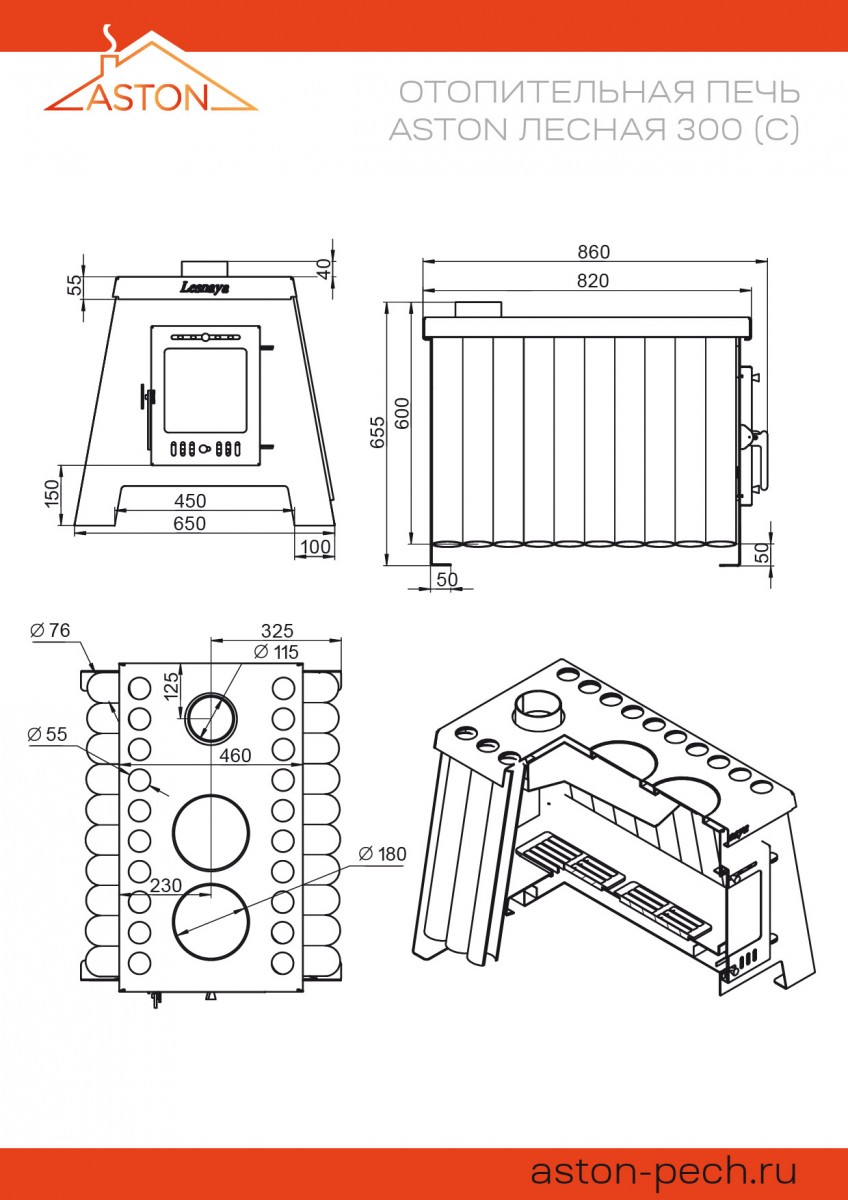 Астон Лесная — отопительная печь конвекционного типа, изготовленная из особо прочной котловой стали. Печь предназначена для обогрева помещений объёмом до 300 кубических метров.