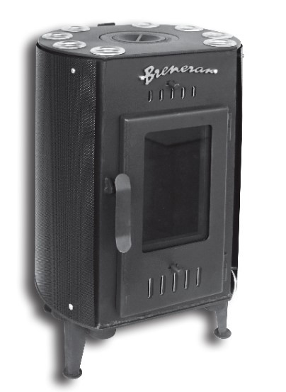 Печь БРЕНЕРАН «КАНАДКА с варочной плитой» – это цельносварная конструкция из стали, покрытая жаропрочной краской (при первой протопке происходит полная ее полимеризация, которая сопровождается характерным запахом). Печь «Бренеран» состоит из двух камер сгорания: нижней камеры – камеры газификации, верхней камеры – камеры дожигания газов. В трубах имеются инжекторы-дожигатели. Эта уникальная конструкция совмещает в себе достоинства газогенераторной печи длительного горения «Бренеран» с возможностью приготовления пищи. Незаменима в условиях отсутствия газа и электричества. Печь БРЕНЕРАН «КАНАДКА с варочной плитой» рассчитана на обогрев помещения объёмом до 50 м3, имеет КПД 60% - 70% и может работать на одной закладке дров до 4-5 часов. Закипание 6-ти литровой ёмкости происходит за 40-60 минут. Приготовление и разогрев пищи на конфорке возможен в режиме горения, а обогрев помещения - в режиме тления. Благодаря тому, что трубы, образующие корпус, полностью находятся в топке печи, происходит максимальный нагрев воздуха, циркулирующего по трубам. Сразу после розжига печи происходит забор холодного воздуха нижними трубами и выход тёплого из верхних, что позволяет теплу быстро и равномерно распространяться по помещению. Температуру на кромке верхних труб (от 50°С до 120°С) можно изменять регулятором мощности. Прибор также позволяет регулировать скорость сгорания топлива - посредством задней заслонки на выходном патрубке печи (регулятора- газификатора). Высокие показатели работы устройства во многом зависят от грамотности монтажа самой печи, её дымохода, степени утепления помещения.