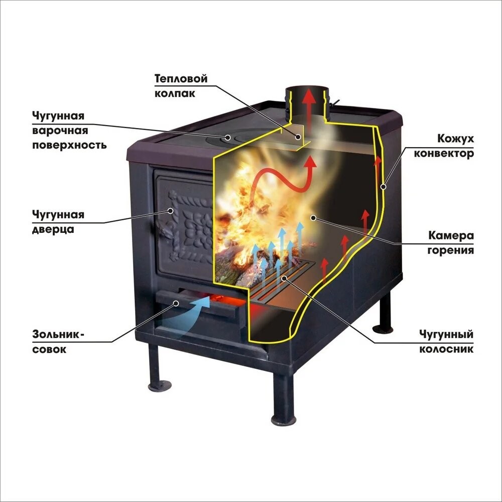 Печь обладает приличным объемом топки для закладки большого количества дров или брикетов для длительного горения и поддержания температуры. Варочная поверхность имеет съемные чугунные кольца для различных видов и размеров посуды.