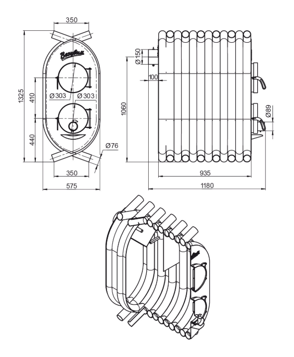 | Размер топочной дверки наружный | ф303 мм |