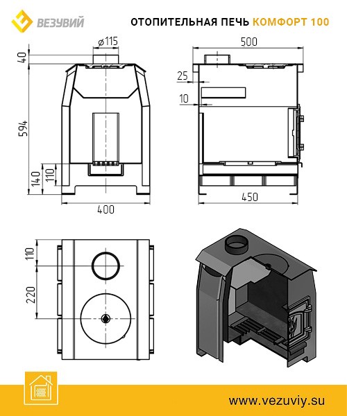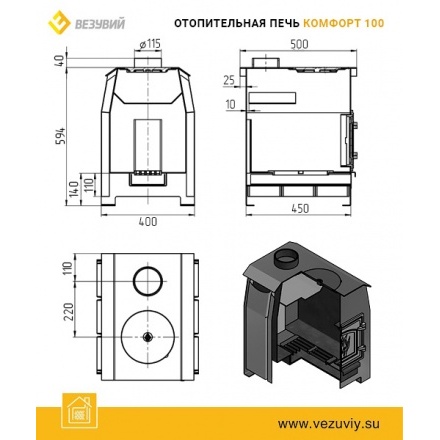 Печь Комфорт можно разместить даже в небольшом по площади помещении, за счет верхнего подключения дымохода, диаметр которого составляет 115 мм, существенно экономится пространство необходимое для установки и эксплуатации печи.