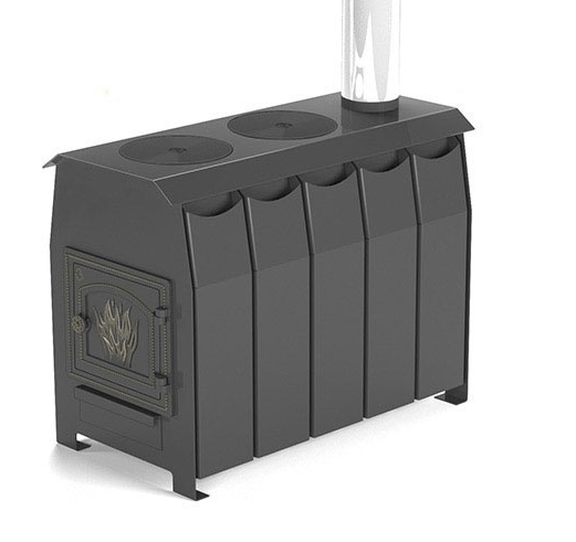 Стальная отечественная отопительная печь Везувий Комфорт 300 (ДТ-3) с возможностью обогрева любого помещения до 300 куб.м, варочной поверхностью с двумя конфорками диаметром 213 мм сверху, оригинальной конструкцией и дизайнерской дверцей, имеет подключение к дымоходу сверху и регулировку интенсивности горения. Небольшие ножки защищают напольное покрытие, конвекционный кожух с карманами по бокам, благодаря естественной конвекции быстро разогревает помещение потоками теплого воздуха, поднимающегося наверх.