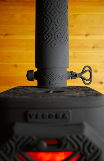Поворотный чугунный шибер-старт исключает полное перекрытие дымохода, поэтому угарный газ не попадёт в помещение — это важное преимущество для домашнего использования.