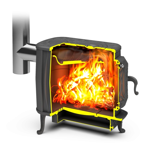чугунный пламяотбойник особой формы направляет потоки горячих газов по правильной траектории