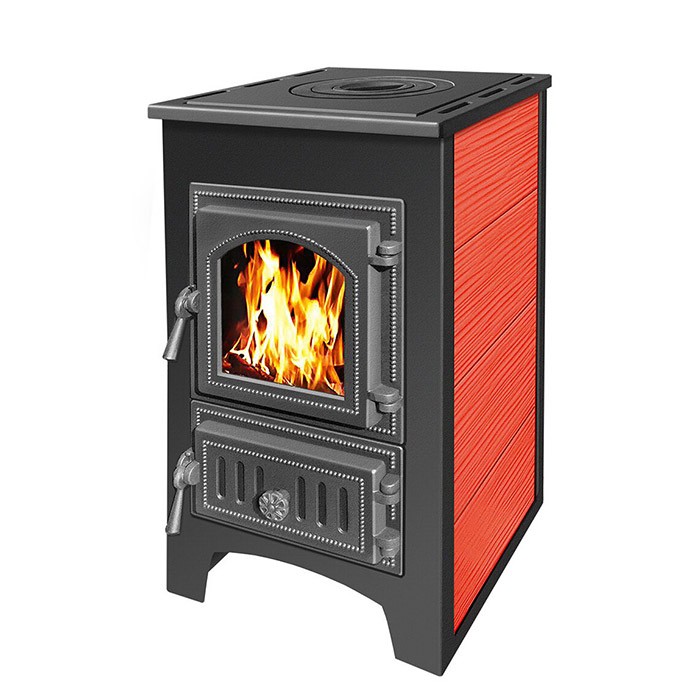 Печь-камин Везувий ПК-01 (270) c плитой красная 9 кВт предназначена для отопления помещений до 150 м3. Камин выполнен из высококачественной конструкционной стали и имеет легкозаменяемые вставки из шамота. В отделке корпуса используются керамические вставки. Для приготовления пищи в конструкции камина предусмотрена чугунная варочная поверхность.