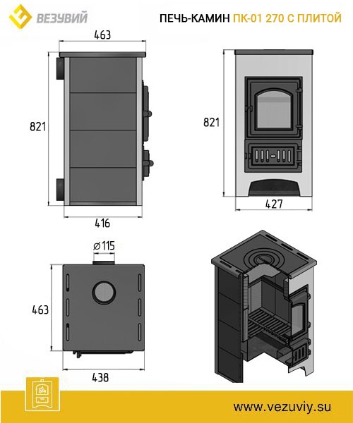 Печь-камин Везувий ПК-01 (270) c плитой красн. 9 кВт Ø115 мм