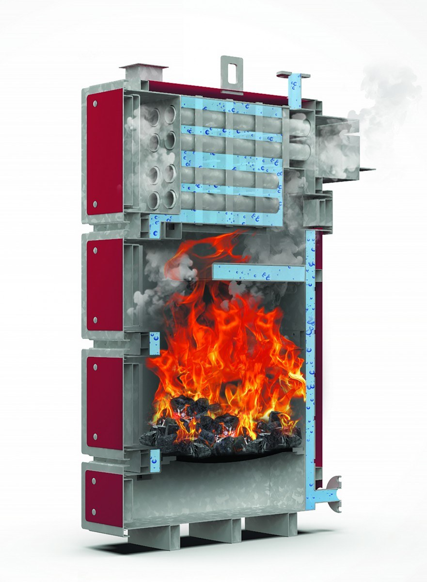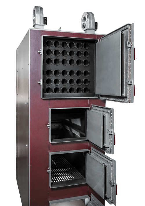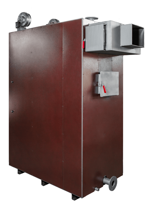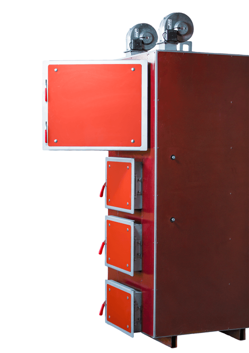 Промышленный отопительный твердотопливный котел "Сибирь Т" - 300 кВт оборудован жаротрубным теплообменником, закрытый снаружи водяной рубашкой. Теплообменник представляет собой многоступенчатую конструкцию дымовых каналов. Горячие газы после зоны дожига проходят через стальной жаротрубный теплообменник, где, отдав тепло, охлаждаются. Охлажденные газы выходят из котла через дымоход, соединенный с дымовым патрубком. Расположение дверей теплообменника, засыпной, камеры сгорания и зольника позволяет получить быстрый доступ к топке для очистки и розжига. Широкая засыпная дверца облегчает загрузку топлива. Воздух, необходимый для правильного процесса сжигания, подается вентилятором благодаря системе наддувных втулок, расположенных непосредственно в области загруженного топлива. Микропроцессорный регулятор постоянно измеряет температуру воды в котле и соответственно устанавливает силу наддува вентилятора, регулируя количество воздуха, необходимого для процесса сжигания.