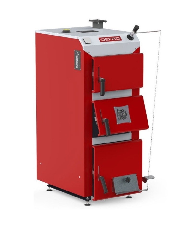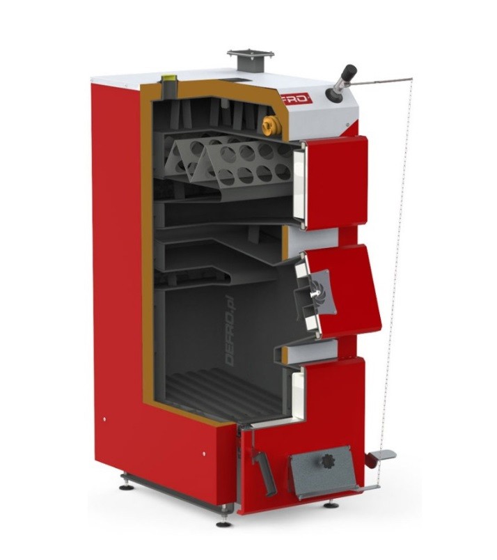 Котлы твердотопливные Defro KDR 50 предназначены для сжигания твердого топлива средней и крупной фракции, в том числе дров. Большая камера сгорания обеспечивает длительное время работы котла. Котлы работают с использованием естественной тяги воздуха, а процесс горения не требует электричества. Количество воздуха, необходимого для процесса горения, контролируется с помощью откидной заслонки в нижней дверце котла, которая может регулироваться вручную или с помощью механического терморегулятора, он же цепочка.