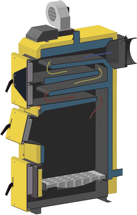 Котлы типа PROFI (KT-2E) – твердотопливные котлы длительного горения. Предназначены для отопления домов, коммунально-бытовых, производственных помещений. В базовой комплектации эксплуатация котла возможна в режиме ручной загрузки твердого топлива. Для перевода котла на работу в автоматическом режиме подачи топлива необходимо дополнительно установить дверцу под пеллетную горелку, саму горелку и бункер для топлива. В котле установлена чугунная колосниковая решетка (15-40 кВт), или водяная колосниковая решетка (50-250 кВт). Многоканальная система подачи воздуха обеспечивает длительное и равномерное сжигание топлива сверху вниз. Такое преимущество позволяет использовать различные виды топлива, разных размеров и фракций. При компактных размерах котел имеет значительную площадь конвекционной поверхности, что обеспечивает высокий уровень КПД и значительно экономит расход топлива. Котлы серии KT-2E оснащены вентилятором и блоком управления для автоматизации работы котла.