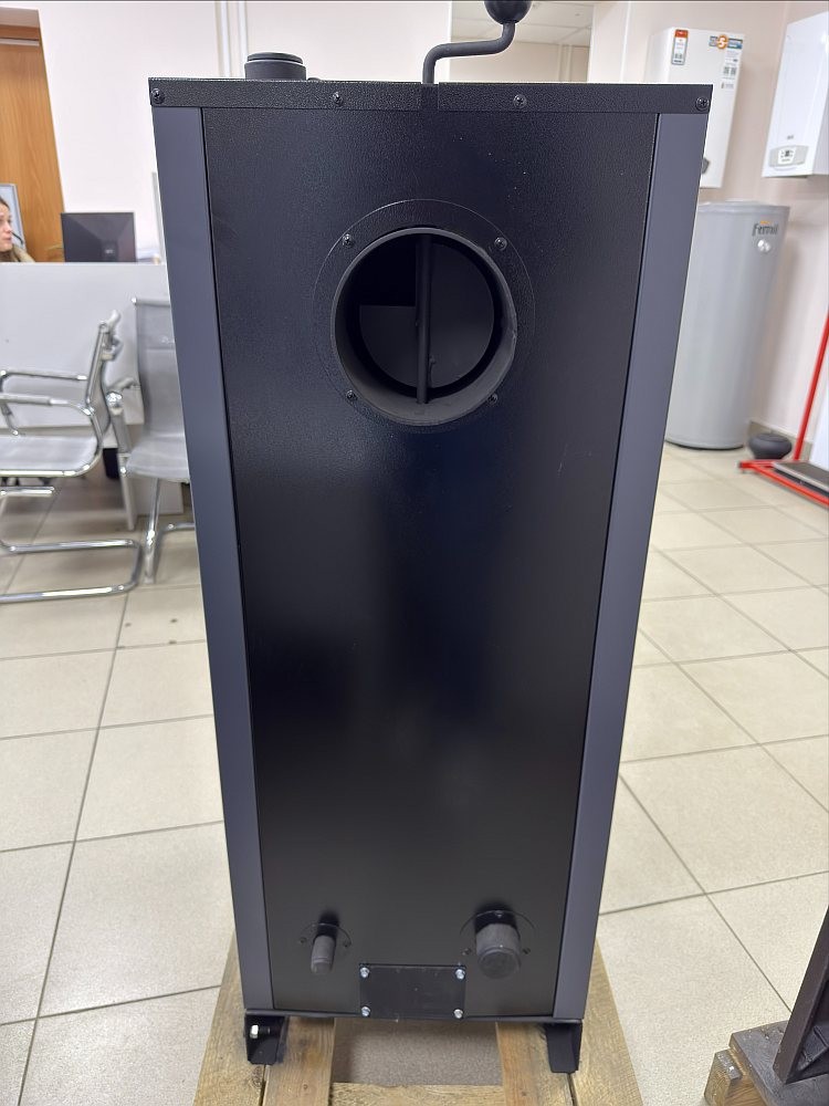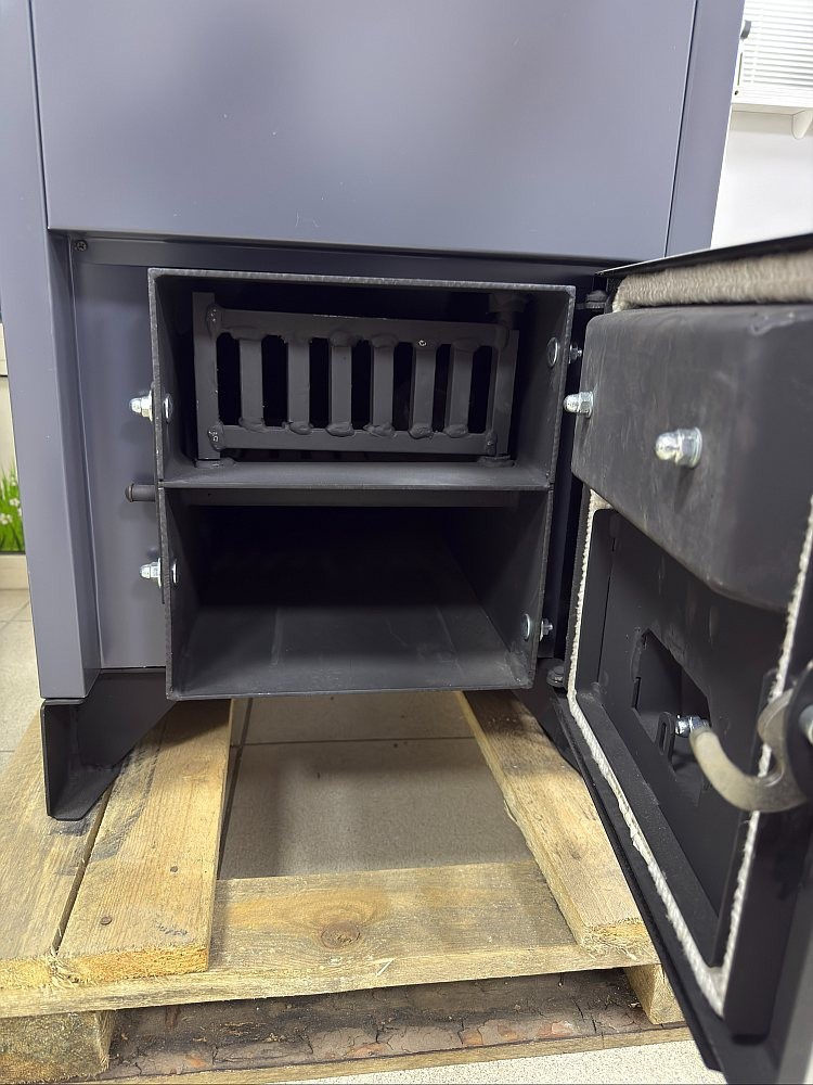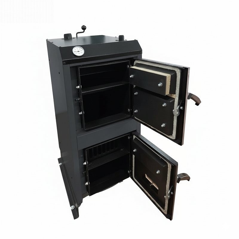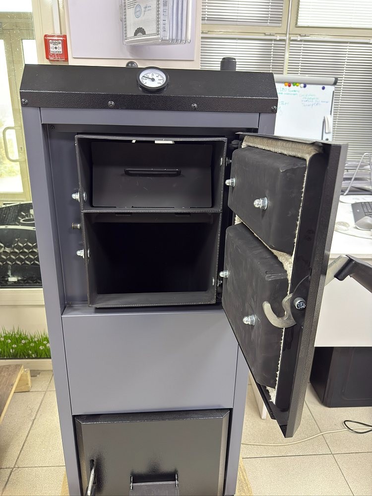 Периодичность загрузки топлива (длительность горения) зависит от его калорийности, влажности и длительности тления, в среднем 6 часов на дровах и 12 часов на угле. Теплообменник котла выполнен с минимальным количеством сварных швов. Топка из цельного листа котловой стали толщиной 4 мм.