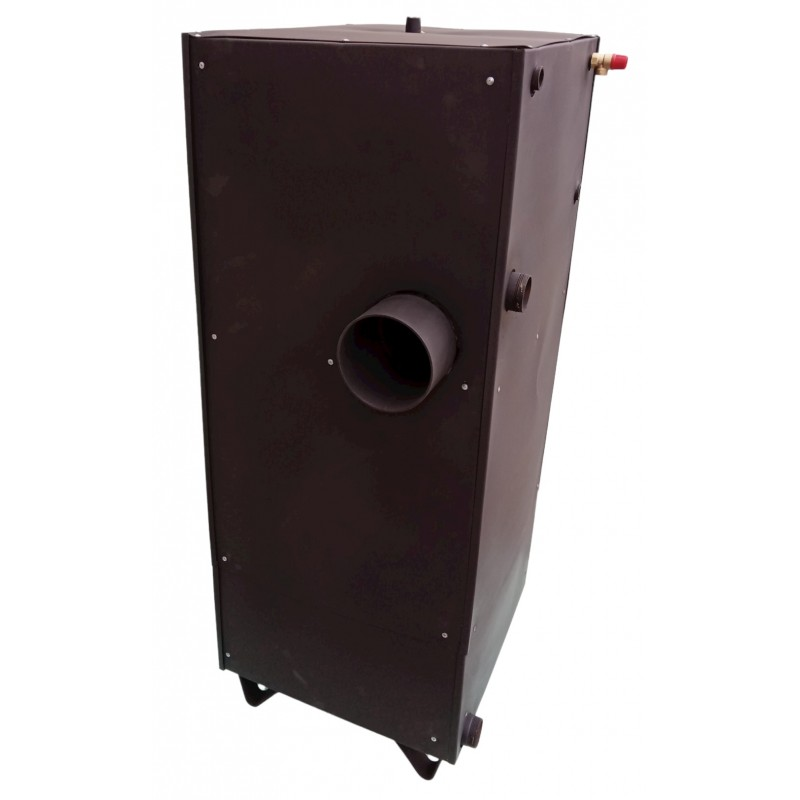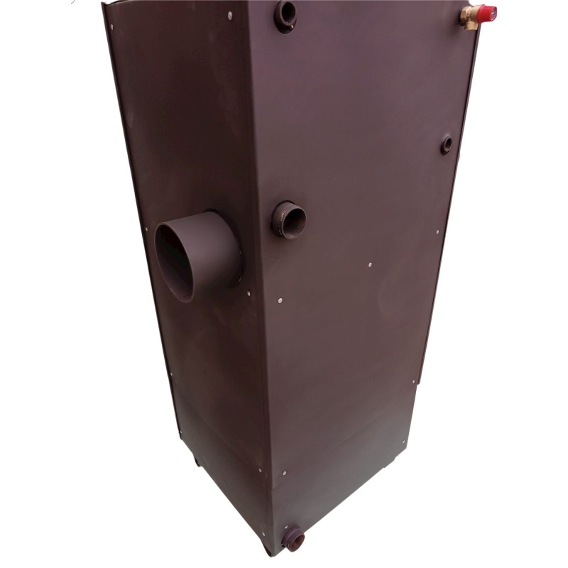 Камера сгорания или, вернее, топка в пиролизных котлах состоит из двух секций: зона загрузки и зона сгорания. В первой части (загрузки) топливо сгорает медленно и пиролизуется, образовывая при этом газы, которые в зоне сгорания (второй) под воздействием вторичного воздуха разгораются, выделяя основное тепло для нагрева воды в контуре. По своей сути пиролизные котлы являются экономическими так как в нем сгорают все составляющие топлива. Помимо этого, процесс горения происходит в течении от 12 часов до 30 часов, в зависимости от способа подачи воздуха. Для сравнения для обычных твердотопливных котлов, работающих на древесном топливе, это время составляет порядка 3 часов. Недостатком этого типа котлов является их более высокая стоимость по сравнению с обычными, сложность конструкции и высокая требовательность к влажности дров. Но благодаря тому, что в данной модели вторичный воздух подается не через форсунку, как в стандартном газогенераторе, а при помощи отверстий на входе в теплообменник, мы немного снизили качество дожига пиролизных газов, но при этом нам удалось также значительно снизить требования к качеству сжигаемого топлива. Поэтому данный котел может работать на одной закладке топлива как хороший газогенератор 12 и более часов, а основной вид топлива, которое он потребляет не технической сушки, а обычная древесина, подвергнутая естественному старению под навесом в течении года и более.