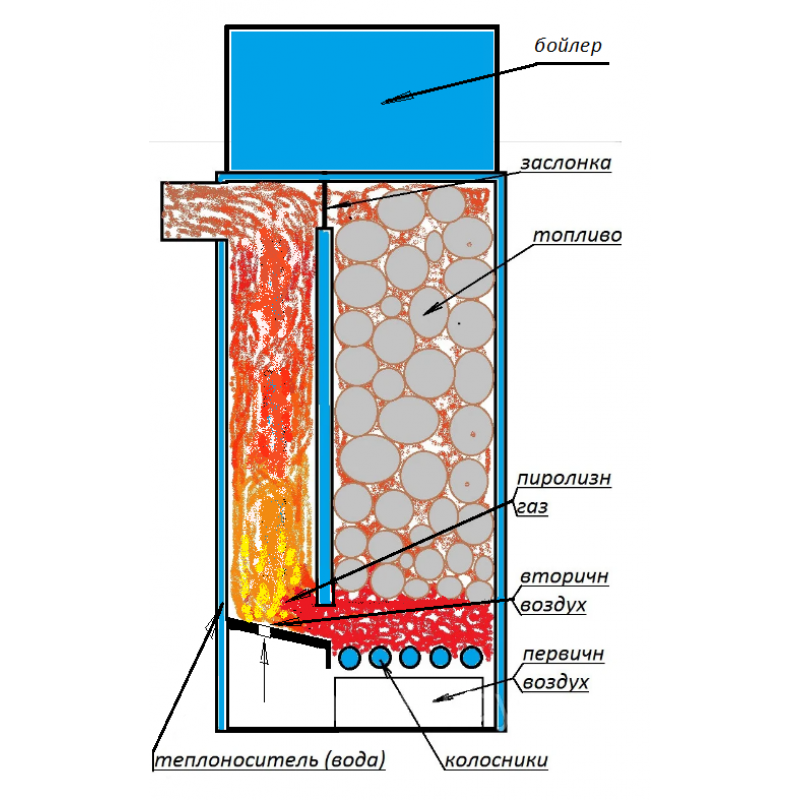 При растопке в верхней части котла открывается первичная заслонка дымовые газы проходят через загруженные дрова, через 5-10 мин. заслонку нужно закрыть, таким образом котел переводится из растопочного в рабочий режим. Дымовые газы начинают проходить через раскаленные угли, разлагаются на горючие составляющие, после попадают в зону дожига со вторичным воздухом, где добавляется немного свободного кислорода, они воспламеняются и догорают в теплообменнике. При этом в горении участвует только нижний ряд дров и по мере сгорания верхние дрова постепенно опускаются в зону горения, что значительно увеличивает время горения. Котел обладает высоким КПД, так как имеет повышенную площадь контакта теплоносителя с огнем (вода циркулирует во всех стенках котла, колосниках и теплообменнике).